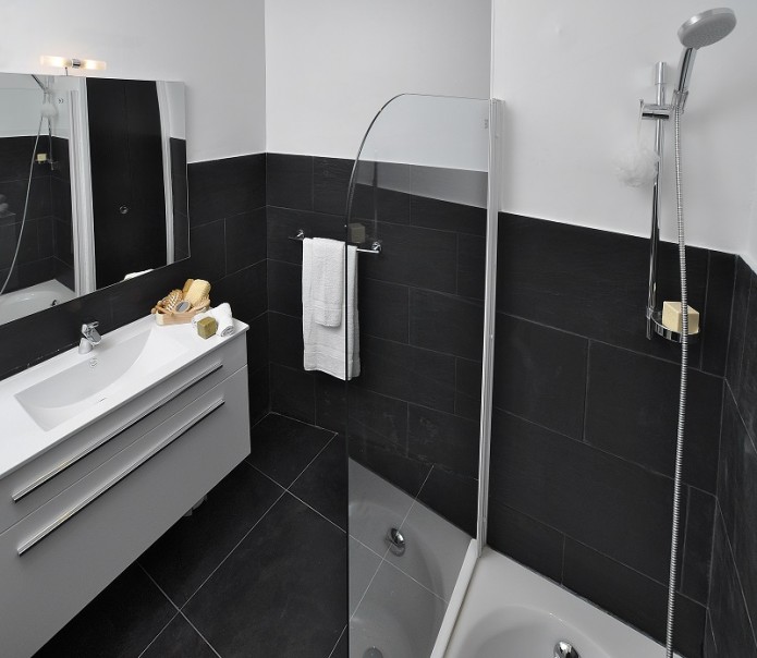 The spacious bathroom shows off slick black stone tiles. There is a stand up shower over a full bath--great for relaxing in loads of bubbles and with a glass of bubbly! There is also a sink with overhead mirror for your daily powder rituals…