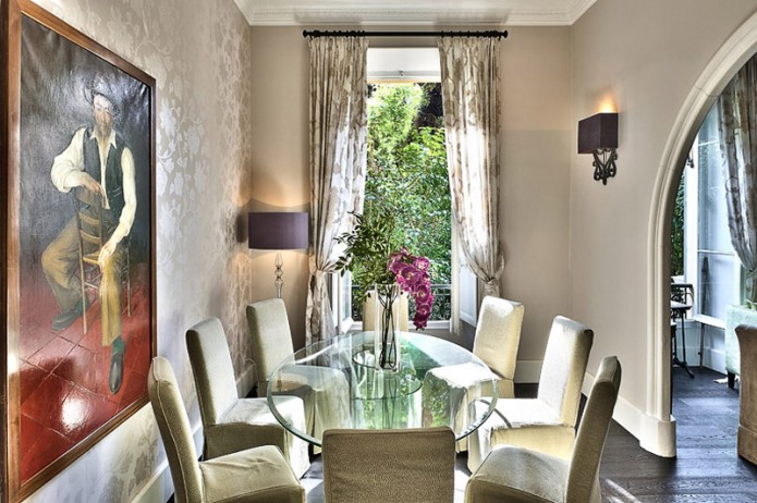 The elegant flowered wallpaper contrasts deliciously with the cream work surfaces and colossal chandelier. The fireplace, quirky appliances, and vintage posters add to the creative and unique interior design, one can find in this holiday rental apartment.